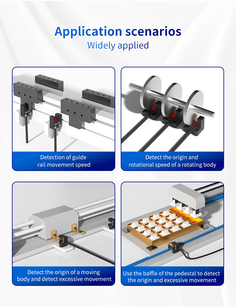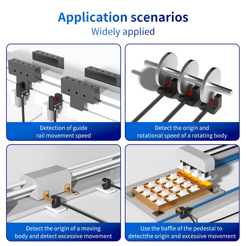 Wszechstronność czujnika rowka U FW25 sprawia, że jest to element powszechnie stosowany w wielu gałęziach przemysłu, w tym w pakowaniu, transporcie materiałów, obróbce CNC i automatyzacji montażu. Wykrywanie prędkości ruchu szyny prowadzącej: W systemach ruchu liniowego flaga zamontowana na ruchomym wózku może przejść przez rowek w kształcie litery U. Zliczając impulsy w czasie, FW25 może dokładnie obliczyć prędkość liniową szyny prowadzącej, umożliwiając monitorowanie i kontrolę prędkości. Wykryj początek i przekroczenie ruchu poruszającego się ciała: czujnik doskonale nadaje się do sekwencji powracania do pozycji bazowej. Wypustka siłownika liniowego lub ramienia robota przechodzi przez rowek, dostarczając do sterownika precyzyjny sygnał „początek” lub „początek”. Dodatkowo na końcu skoku można umieścić drugi czujnik, który wykrywa nadmierny skok, zapobiegając uszkodzeniom mechanicznym i zapewniając bezpieczeństwo pracy. Wykrywanie pochodzenia i prędkości obrotowej korpusu obrotowego: Zamontuj pojedynczy zaczep lub koło wielozębne na obracającym się wale. Gdy każda wypustka przechodzi przez 5 mm rowek, FW25 generuje impuls. Pojedynczy impuls na obrót dostarcza danych o pochodzeniu, podczas gdy wiele impulsów pozwala na dokładne obliczenie prędkości obrotowej (RPM), niezbędnej do sterowania silnikiem i monitorowania procesu. Używaj z przegrodami wsporników montażowych do pozycjonowania: Wiele systemów wykorzystuje proste, stałe przegrody. FW25 można sparować ze wspornikiem montażowym lub niestandardowymi elementami w celu wykrycia obecności lub położenia tych przegród, tworząc prosty i ekonomiczny system wyłączników krańcowych.
