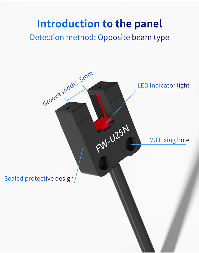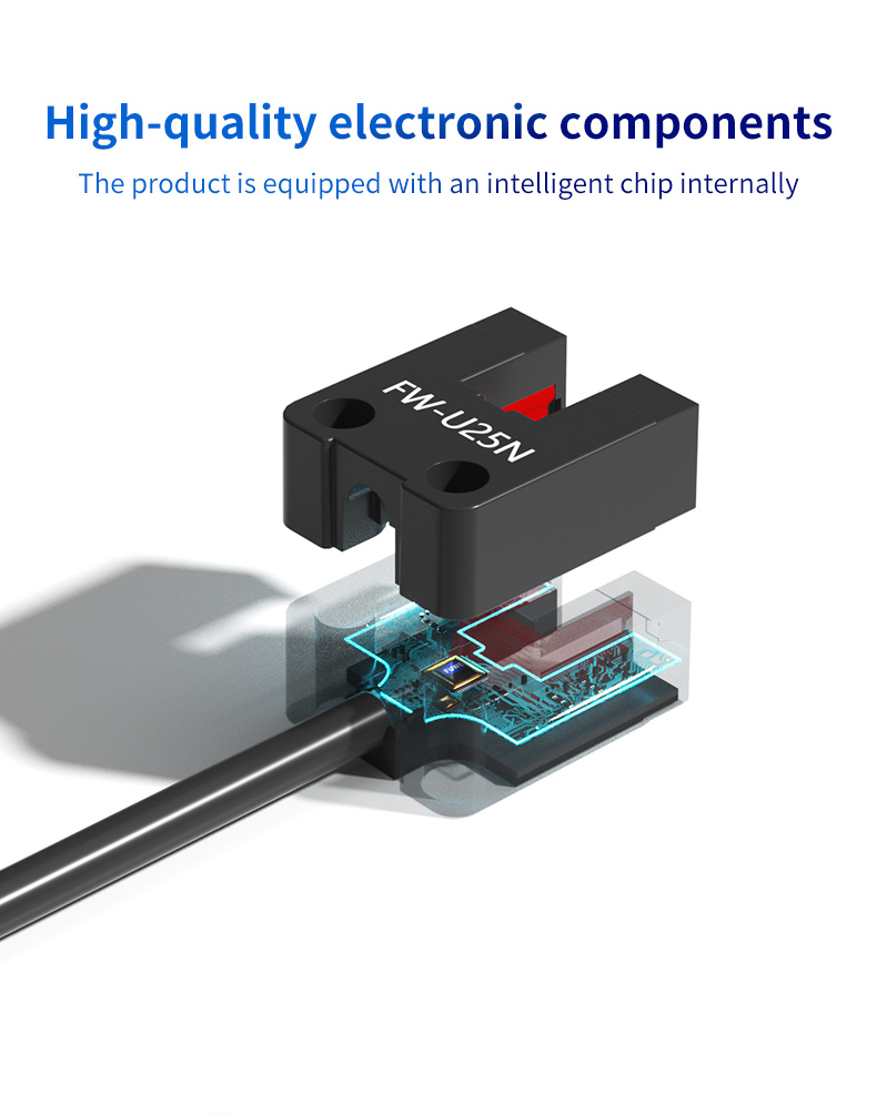Meta opis: Odkryj czujnik fotoelektryczny z rowkiem w kształcie litery U serii FW25 o szerokości wykrywania 5 mm. Wyposażony w inteligentny chip, integralną obudowę i wszechstronne modele do wykrywania pochodzenia, monitorowania prędkości obrotowej i sterowania szyną prowadzącą. Idealny do solidnych zastosowań w automatyce przemysłowej.