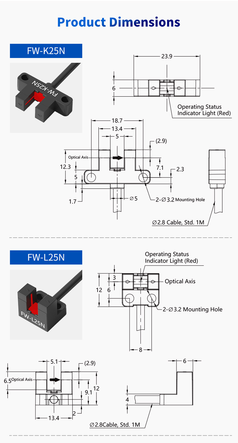 Sercem serii FW25 jest precyzyjnie zaprojektowana szerokość rowka wynosząca 5 mm. Ta kompaktowa, ale skuteczna konstrukcja pozwala na wykrywanie bardzo małych obiektów, cienkich flag lub zaczepów siłownika przechodzących przez szczelinę. Zasada wykrywania wiązki przechodzącej w rowku zapewnia wysoką odporność na światło otoczenia i odbicie powierzchni, zapewniając stabilny i niezawodny sygnał nawet w trudnych warunkach. Dzięki temu idealnie nadaje się do zastosowań wymagających dokładnej dokładności pozycjonowania, takich jak wykrywanie początku w prowadnicach liniowych lub liczenie zębów na małej przekładni.