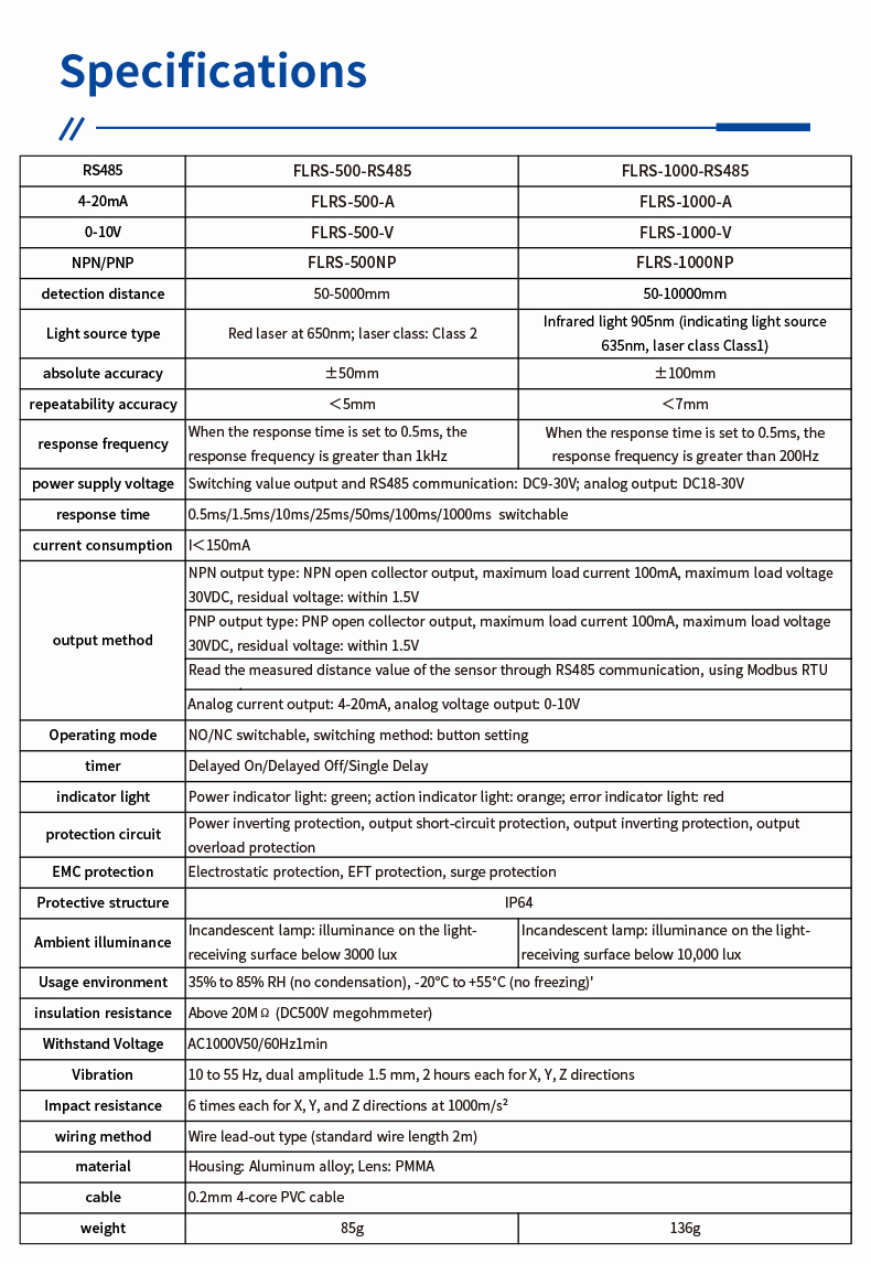 Zbudowana z wielowarstwowej ochrony — obejmującej ochronę elektrostatyczną, EFT i ochronę przeciwprzepięciową — seria FLRS chroni Twój sprzęt i zwiększa bezpieczeństwo operacyjne. Jego kompaktowa, zintegrowana konstrukcja pomiarowa i sterująca minimalizuje wymagania przestrzenne i zmniejsza złożoność okablowania, oferując zarówno wydajność, jak i łatwość instalacji. Wybierz spośród modeli takich jak FLRS-1000-RS485 (50–10 000 mm) lub FLRS-500-RS485 (50–5 000 mm), aby dopasować je do konkretnych wymagań.