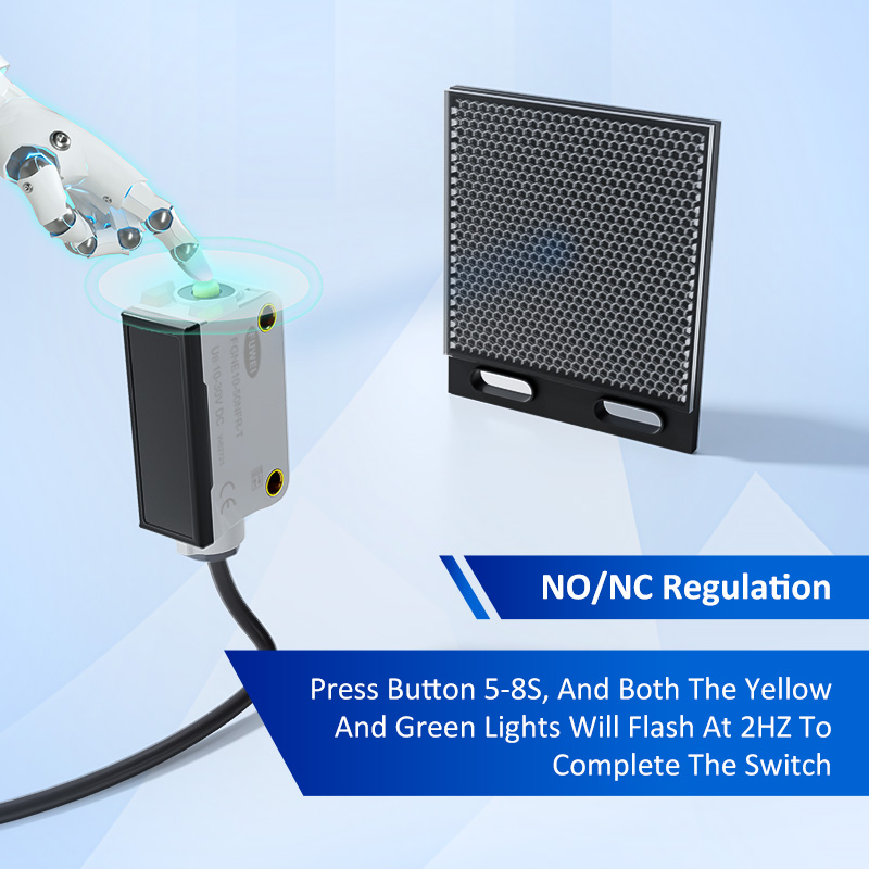 Urządzenie jest wyposażone w wysoce inteligentne funkcje regulacji. Ustawienia odległości są intuicyjne i wygodne: Wyrównaj z płytą odblaskową, naciśnij przycisk przez 2-5 sekund, a żółto-zielone światło migające przy 4Hz wskazuje na udaną konfigurację; Jeśli podwójne światła przełączają się na asynchroniczne migać 8 Hz, wskazuje to na awarię i automatycznie przełącza się na maksymalną odległość wykrywania. Przełączanie między normalnie otwartymi (NO) a normalnie zamkniętym (NC) jest równie wydajne-naciśnij przycisk przez 5-8 sekund, a podwójne światła będą migać zsynchronizowane przy 2Hz, aby potwierdzić, że przełącznik trybu jest zakończony. Ten wieloosobowy przełącznik fotoelektryczny kompatybilny z soczewką sprawia, że regulacja parametrów jest bardziej intuicyjna niż kiedykolwiek.