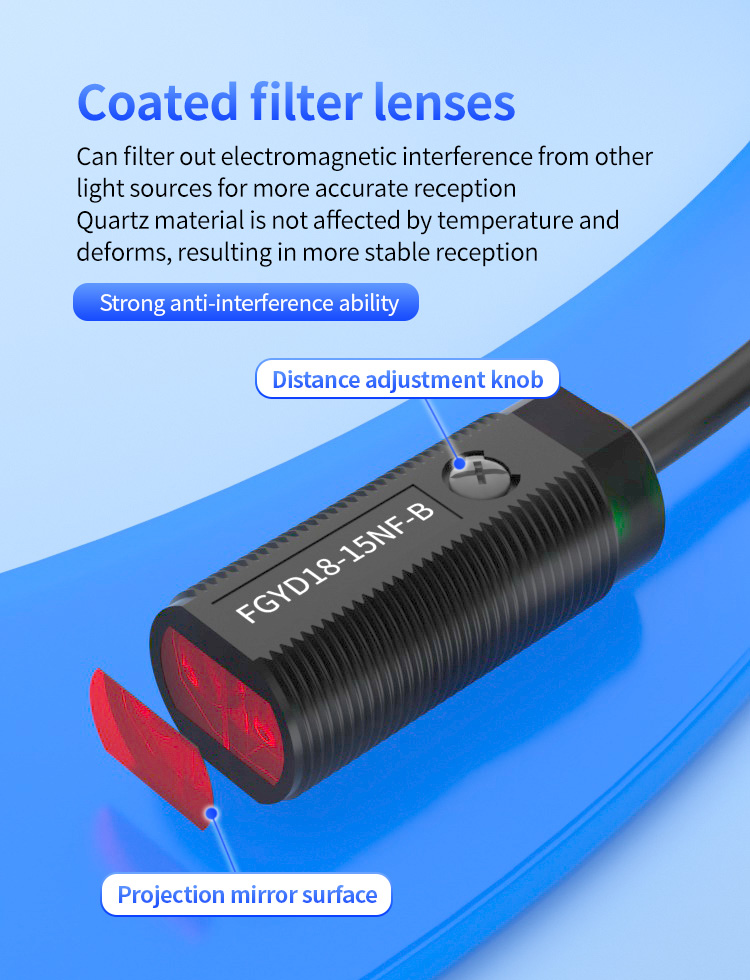 Front-end czujnika ma powlekany obiektyw filtracyjny, który skutecznie filtruje zbłąkane światło i zakłócenia elektromagnetyczne ze środowiska, zapewniając dokładne i stabilne odbiór sygnału. Wykonany z materiału kwarcowego, soczewka opiera się wysokie temperatury i deformacji, utrzymując wyjątkową wydajność nawet w środowiskach o znacznych wahaniach temperatury. Ten projekt dodatkowo zwiększa niezawodność czujników wykrywania maszyn sprężynowych w trudnych warunkach pracy.