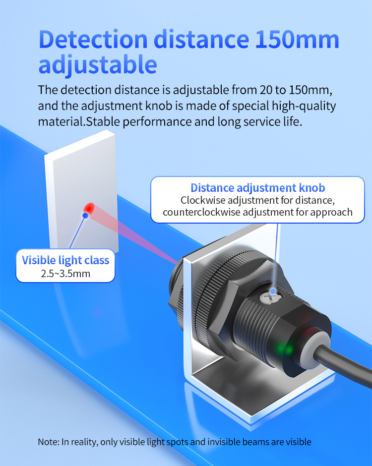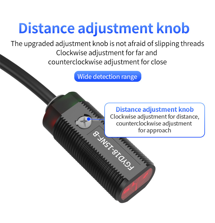 Ponadto regulowana odległość wykrywania 150 mm wyróżnia się jako kolejna kluczowa funkcja. Seria FGYD18 oferuje elastyczną regulację zakresu wykrywania między 20-150 mm. Użytkownicy mogą łatwo ustawić pożądaną odległość za pomocą wysokiej jakości pokrętła regulacji. Ta konstrukcja zapewnia stabilną wydajność i przedłużoną żywotność, ustawiając ją jako precyzyjny czujnik fotoelektryczny. Podczas automatycznej kontroli precyzyjna kontrola odległości ma kluczowe znaczenie-niezależnie od delikatnego pozycjonowania obiektów lub operacji linii montażowej, czujnik ten zapewnia spójną odpowiedź. Wyobraź sobie, że osiągnięcie wydajnego wykrywania w centrach obróbki CNC lub narzędzi maszynowych bez częstej realibracji - niewątpliwie oszczędza czas i koszty.