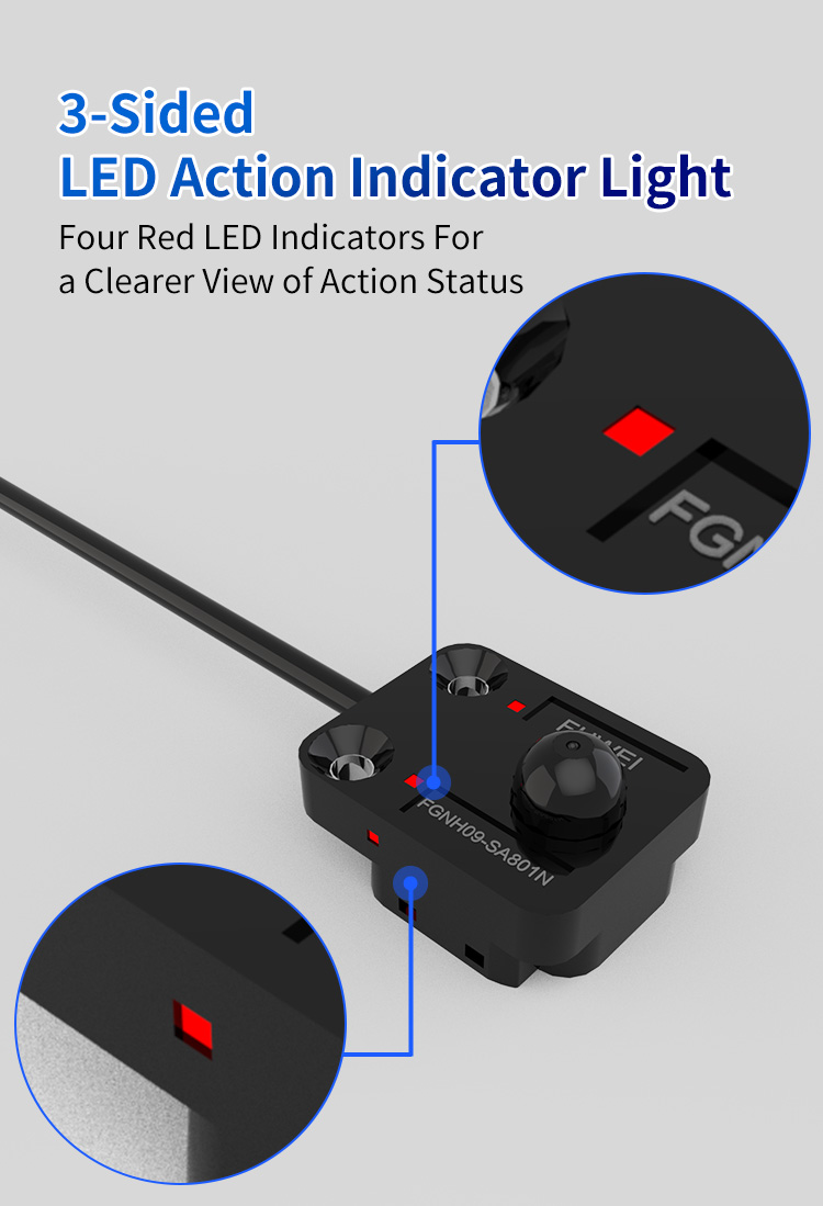 W ruchliwej stronie produkcyjnej, czy status roboczy czujnika jest wyraźnie widoczny, bezpośrednio wpływa na wydajność osądu operatorów. Innowacyjnie FGNH09-SA801N ma 3-stronicowe wskaźniki działania LED: 2 po bokach i 2 na górze, łącznie 4 czerwone koraliki LED. Ten układ pozwala operatorom wyraźnie zobaczyć status włączania/wyłączania wskaźników z przodu, boku lub górnej części sprzętu i śledzić stan roboczy czujnika w czasie rzeczywistym.