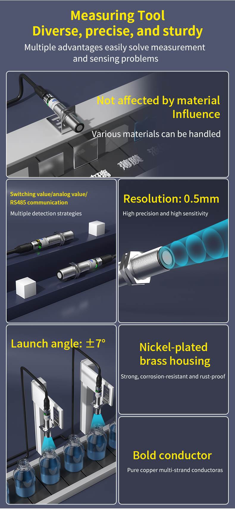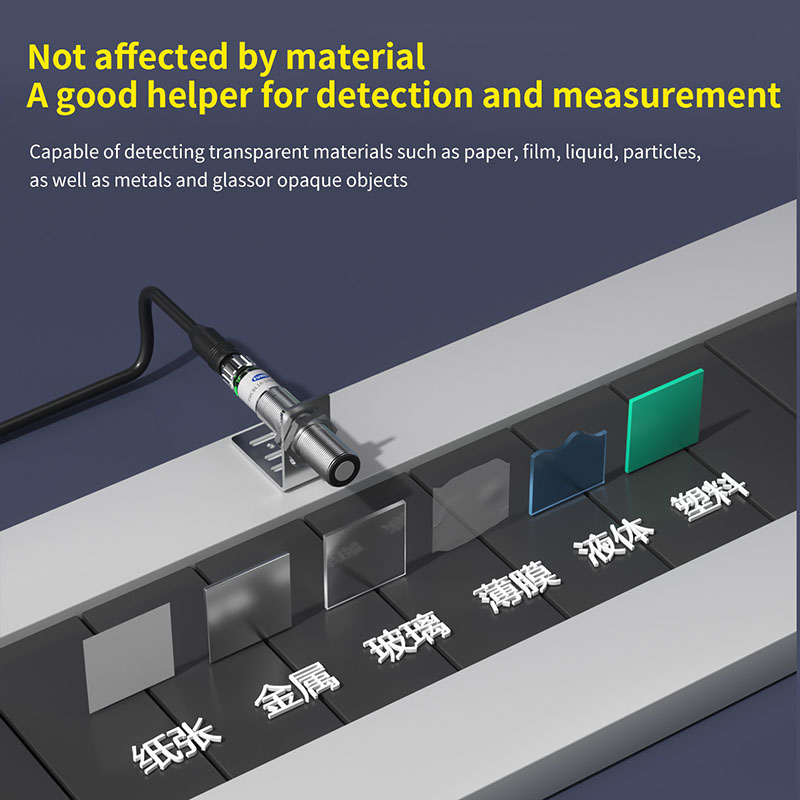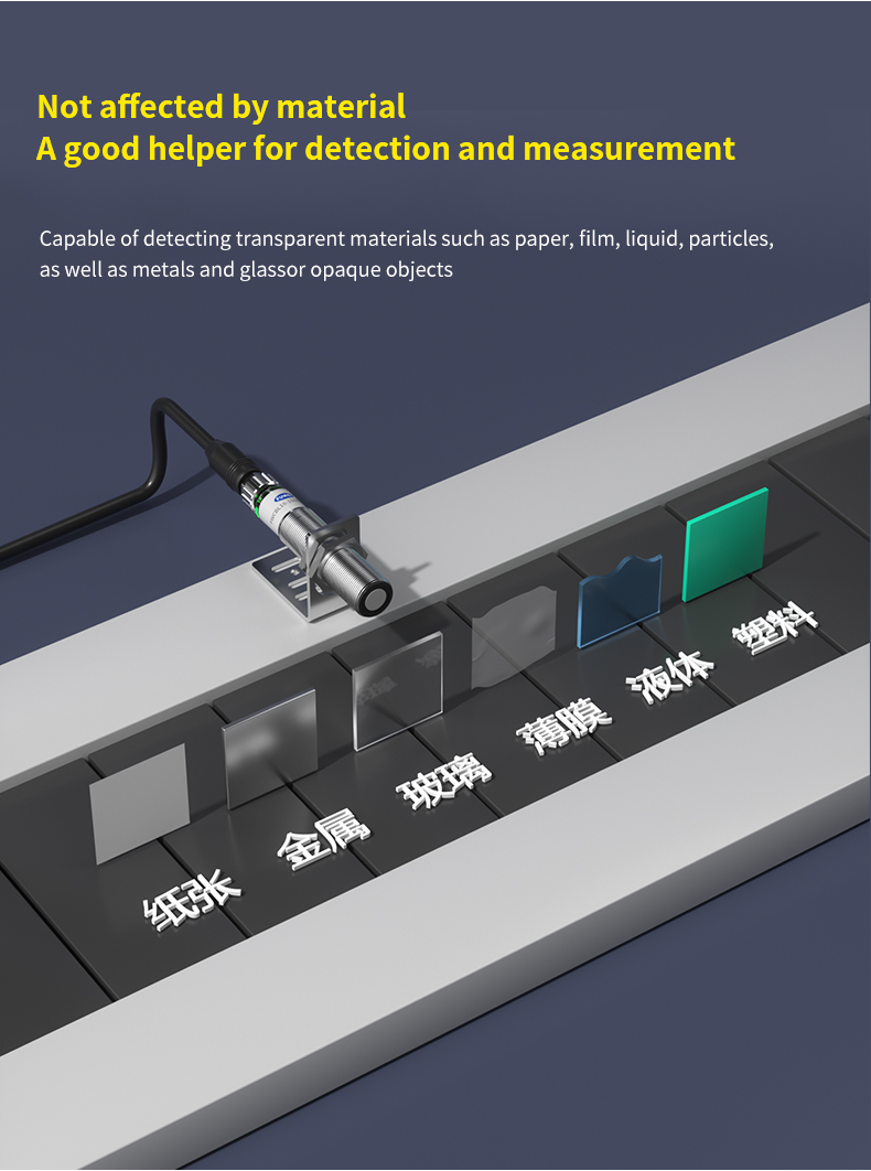 Charakteryzując się wysoką precyzją rozdzielczości 0,5 mm i wąskim kątem emisji ±7°, zapewnia wyjątkową dokładność pomiaru i doskonałą odporność na zakłócenia. Niezależnie od powierzchni docelowej – pochłaniającej światło, odblaskowej czy przezroczystej – zapewnia stabilną pracę, całkowicie niezależną od materiału lub koloru wykrytego obiektu.